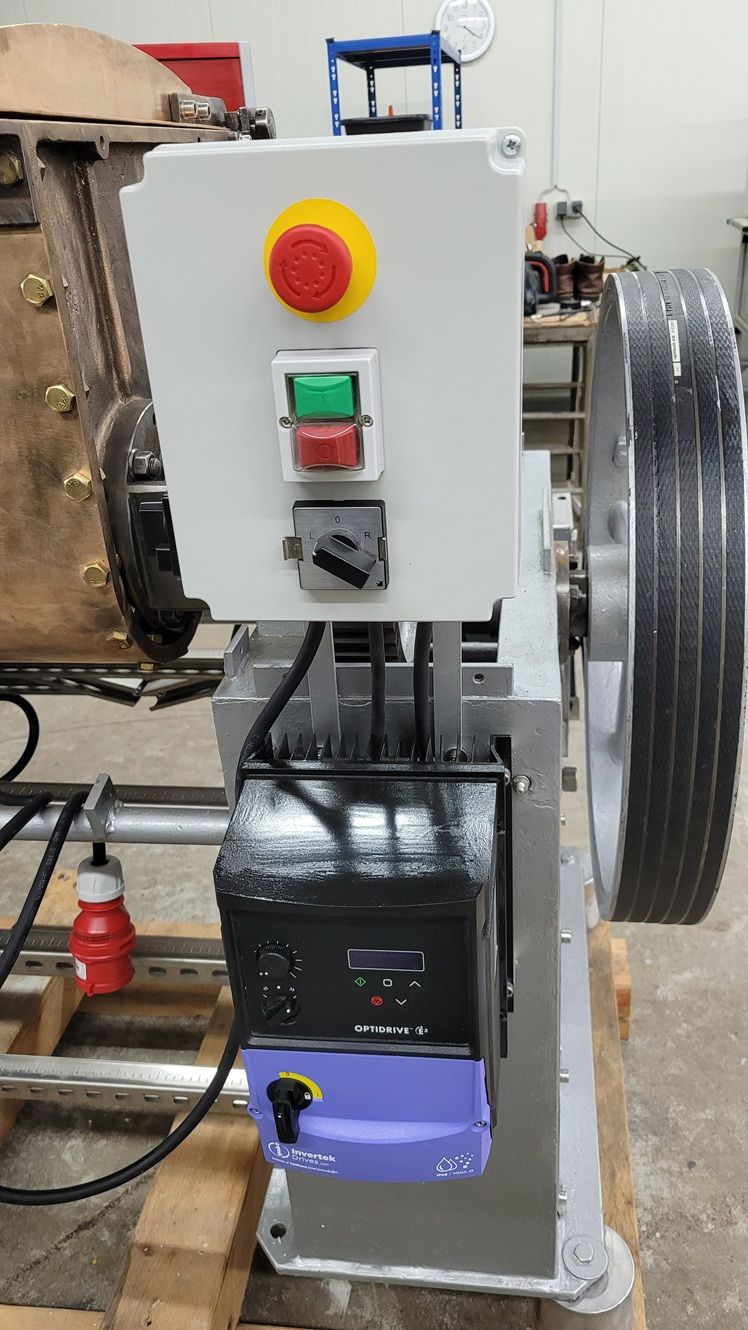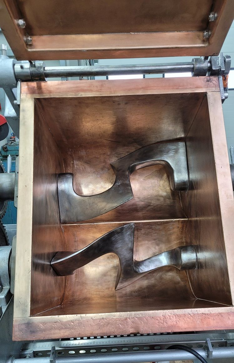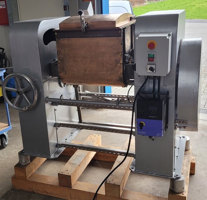 Doppel-Z-Kneter / Sigmakneter / Schaufelkneter / Trogkneter Fabrikat Hermann Linden, Baujahr 1965, Maschinentyp K II 60, Fabrik-Nr. 605, Generalüberholt in 2025, elektrische Ausrüstung komplett neu, Frequenzgesteuerter Elektromotor 4,0 KW, Frequenzumrichter Optidrive E3 IP66 Outdoor mit Hauptschalter, Potentiometer und Drehrichtungsumkehr, Schaltkasten mit Hauptschalter, Not-Aus und Unterspannungsauslösung, Drehzahl von ca. 15 bis 60 U/min., Riemenantrieb, 2 Z-Wellen, alle produktberührenden Teile in Kupfer und Edelstahl, einwandiger Kupfer-Behälter ca. 430 x 520 x 400 mm = ca. 90 Liter, Nutzinhalt ca. 60 Liter, Entleerung durch manuelle Kippung mittels Handrad, Gewicht ca. 1200 kg, Gesamtabmessung ca. 1500 x 1500 x 1500 mm. Sehr stabile Ausführung. Geschmiert mit H1 Lebensmittelfett.